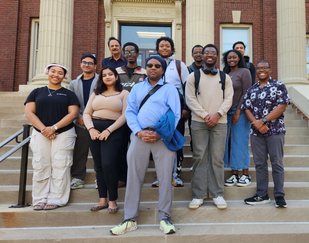 The Misra Laserspectroscopy Lab Research Group in spring 2025 posing in front of Thirkield Hall at Howard University.
