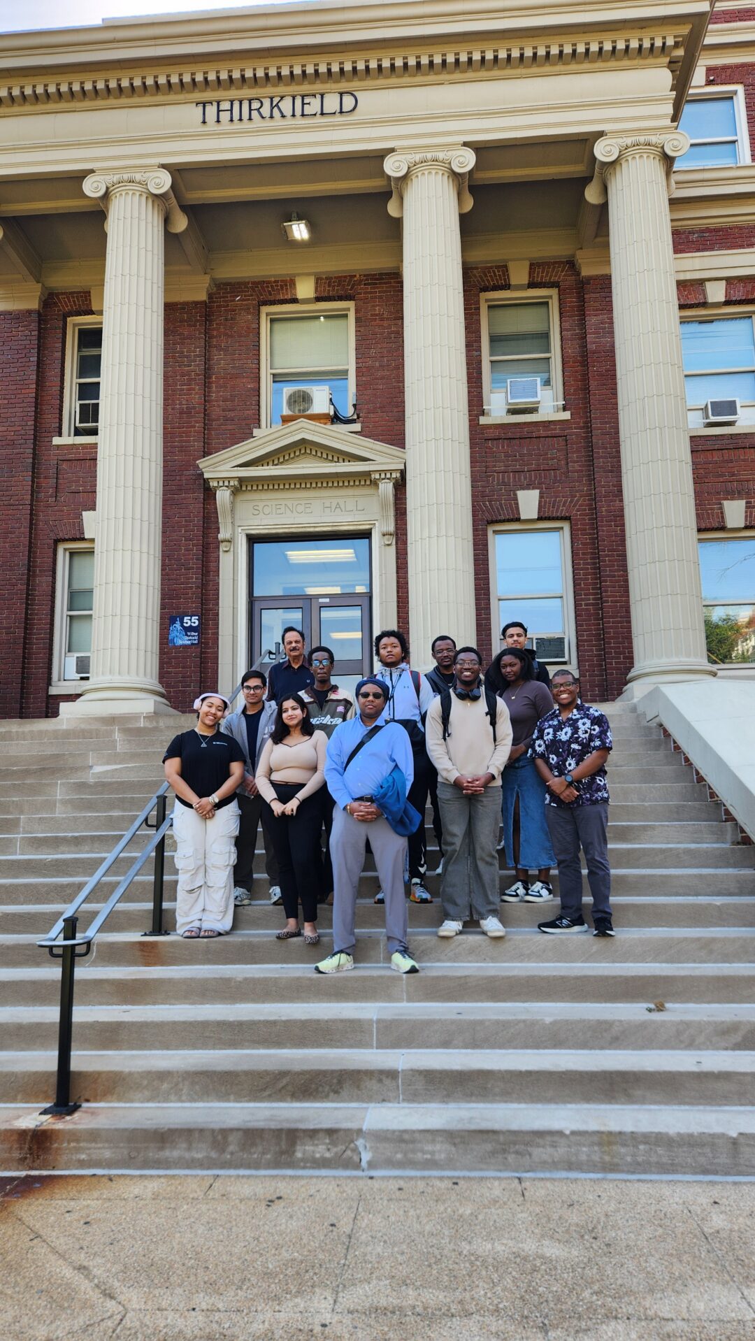 The Misra Laserspectroscopy Lab Research Group in spring 2025 posing in front of Thirkield Hall at Howard University.